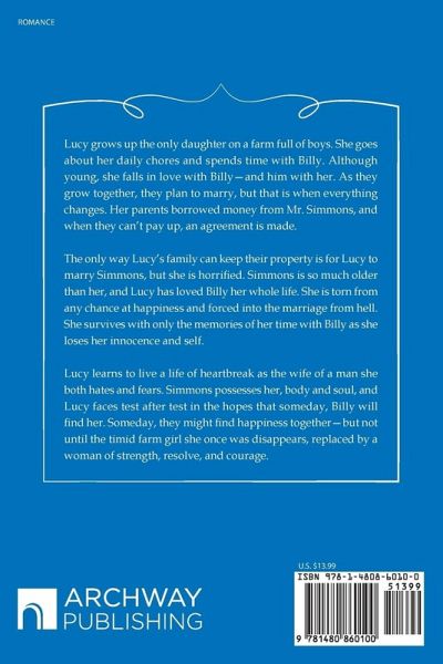 Lucy grows up the only daughter on a farm full of boys. She goes about her daily chores and spends time with Billy. Although young, she falls in love with Billyand him with her. As they grow together, they plan to marry, but that is when everything changes. Her parents borrowed money from Mr. Simmons, and when they cant pay up, an agreement is made. The only way Lucys family can keep their property is for Lucy to marry Simmons, but she is horrified. Simmons is so much older than her, and Lucy has loved Billy her whole life. She is torn from any chance at happiness and forced into the marriage from hell. She survives with only the memories of her time with Billy as she loses her innocence and self. Lucy learns to live a life of heartbreak as the wife of a man she both hates and fears. Simmons possesses her, body and soul, and Lucy faces test after test in the hopes that someday, Billy will find her. Someday, they might find happiness togetherbut not until the timid farm girl she once was disappears, replaced by a woman of strength, resolve, and courage.