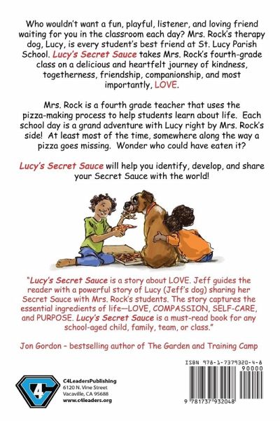 Who wouldn't want a fun, playful, great listener, and loving friend waiting for you in the classroom each day? Mrs. Rock's therapy dog, Lucy, is every student's best friend at St. Lucy Parish School. Lucy's Secret Saucetakes Mrs. Rock's fourth-grade class on a delicious and heartfelt journey of kindness, togetherness, friendship, companionship, and most importantly, LOVE. Mrs. Rock is a teacher who uses the pizza-making process to help her students learn about life. She teaches her class how to "Feed the Starter" (nurture their well-being, both physically and mentally). Throughout the story, Mrs. Rock's students learn valuable life lessons from both Lucy and Mrs. Rock. The result-each student's future development of their own "Secret Sauce." And if that wasn't enough... Yes, there might be some pizza that goes missing along the way. Wonder who could have eaten it? Lucy's Secret Sauce will serve as a bridge to deep and meaningful conversations. Lucy's Secret Sauce will make you laugh and cry. This book can be read as a family, a class, or by individuals. When you finish reading your heart will be full of love and joy. Most of all, you will leave this story ready to identify, develop, and share your Secret Sauce with the world! You might also be hungry for a slice of pizza!