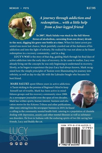In 2007, Mark Saluke sped down a seemingly inevitable path toward an early death. Stuck in the full-blown throes of alcoholism, he careened from one dreary drunk to the next, digging his grave one bottle at a time. When another arrest provided one more last chance, Mark painfully crawled out of the darkness of his addiction and into the light of sobriety. And somewhere, in the blur of those first painful snippets of his early recovery, there was a dog. LUCY'S WAY is the story of this dog, guiding Mark through his final days of active addiction into the early days of recovery. In a journey tying together the threads of addiction, pets and Taoism into a unique tapestry, Mark comes to realize Lucy was already living out the concepts he was only beginning to understand in recovery. Slowly, as he began to experience the joys Lucy had always known, Mark recognized how the simple principles of Taoism were illuminating his journey into sobriety, as well as day-to-day life with the Labrador beagle who became his best friend.