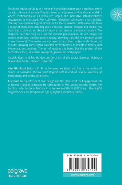 This book establishes play as a mode of humanistic inquiry with a profound effect on art, culture and society. Play is treated as a dynamic and relational modality where relationships of all kinds are forged and inquisitive interdisciplinary engagement is embraced. Play cultivates reflection, connection, and creativity, offering new epistemological directions for the humanities. With examples from a range of disciplines including poetry, history, science, religion and media, this book treats play as an object of inquiry, but also as a mode of inquiry. The chapters, each focusing on a specific cultural phenomenon, do not simply put culture on display, they put culture in play, providing a playful lens through which to see the world. The reader is encouraged to read the chapters in this book out of order, allowing constructive collision between ideas, moments in history, and theoretical perspectives. The act of reading this book, like the project of the humanities itself, should beemergent, generative, and playful.
