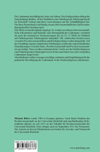 Das Werk ist interdisziplinär angelegt. Es werden sowohl psychowissenschaftliche Erkenntnisse und Befunde zum Störungsbild der Ludomanie vermittelt als auch die normativen Voraussetzungen der §§ 20, 21 StGB im Hinblick auf Pathologisches Glücksspielen behandelt. Die zahlreichen Kontroversen zwischen Psychowissenschaften und Rechtsprechung werden dargestellt. Auf der Grundlage eigener empirischer Erhebungen werden die unterschiedlichen Einschätzungen zwischen Justiz, Rechtswissenschaft und Psychowissenschaften gewürdigt.