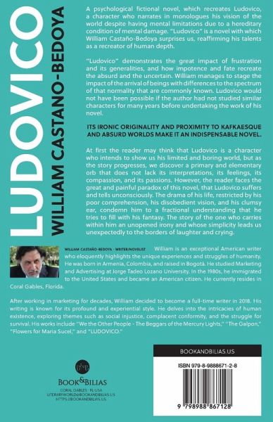 A psychological fictional novel, which recreates Ludovico, a character who narrates in monologues his vision of the world despite having mental limitations due to a hereditary condition of mental damage. "Ludovico" is a novel with which William Castaño-Bedoya surprises us, reaffirming his talents as a recreator of human depth."Ludovico" demonstrates the great impact of frustration and its generalities, and how impotence and fate recreate the absurd and the uncertain. William manages to stage the impact of the arrival of beings with differences to the spectrum of normality that is commonly known. Ludovico would not have been possible if the author had not studied similar characters for many years before undertaking the work of his novel.At first, the reader may think that Ludovico is a character who intends to show us his limited and boring world, but as the story progresses, we discover a primary and elementary orb that does not lack its interpretations, its feelings, its compassion, and its passions. However, the reader faces the great and painful paradox of this novel, which Ludovico suffers and tells unconsciously. The drama of his life, restricted by his poor comprehension, his disobedient vision, and his clumsy ear, condemns him to a fractional understanding that he tries to fill with his fantasy. The story of the one who carries within him an unopened irony and whose simplicity leads us unexpectedly to the borders of laughter and crying.