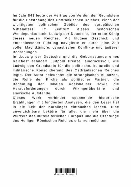 Im Jahr 843 legte der Vertrag von Verdun den Grundstein für die Entstehung des Ostfränkischen Reiches, eines der wichtigsten politischen Gebilde des europäischen Mittelalters. Im Zentrum dieses historischen Wendepunkts steht Ludwig der Deutsche, der erste König dieses neuen Reiches. Mit klugem Geschick und entschlossener Führung navigierte er durch eine Zeit voller Machtkämpfe, dynastischer Konflikte und äußerer Bedrohungen.In "Ludwig der Deutsche und die Geburtsstunde eines Reiches" schildert Luitpold Frenzel eindrucksvoll, wie Ludwig den Grundstein für die politische, kulturelle und militärische Konsolidierung des Ostfränkischen Reiches legte. Der Autor beleuchtet die strategischen Allianzen, die Rolle der Kirche als politischer Partner, die Bedeutung der lokalen Adelshäuser sowie die Herausforderungen durch Wikingerüberfälle und slawische Aufstände.Dieses Werk verbindet spannende historische Erzählungen mit fundierten Analysen, die den Leser tief in die Zeit der Karolinger eintauchen lassen. Eine unverzichtbare Lektüre für alle, die mehr über die Wurzeln des mittelalterlichen Europas und die Ursprünge des Heiligen Römischen Reiches erfahren möchten.