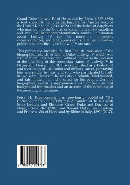 Grand Duke Ludwig IV of Hesse and by Rhine (1837-1892) is best known to many as the husband of Princess Alice of the United Kingdom (1843-1878) and the father of daughters who married into the Houses of Romanov and Hohenzollern and into the Battenberg/Mountbatten family. Information about Ludwig IV can be found in memoirs, correspondences, and biographies of his relatives. However, publications specifically on Ludwig IV are rare.This publication includes the first English translation of the biographical sketch of Grand Duke Ludwig IV which was written by military historian Gebhard Zernin on the occasion of the unveiling of the equestrian statue of Ludwig IV in Darmstadt, Hesse, in 1898. It was published as a Festschrift and focuses on his education and military career, portraying him as a soldier in heart and soul who participated bravely in two wars. However, he was also a humble, kind-hearted, and fair-minded man who cared for his people. Zernin's biographical sketch is supplemented with concise historical background information and an account of the ceremony of the unveiling of the statue.