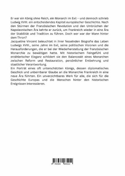 Er war ein König ohne Reich, ein Monarch im Exil - und dennoch schrieb Ludwig XVIII. ein entscheidendes Kapitel europäischer Geschichte. Nach den Stürmen der Französischen Revolution und den Umbrüchen der Napoleonischen Ära kehrte er zurück, um Frankreich wieder in eine Ära der Stabilität und Tradition zu führen. Doch wer war der Mann hinter dem Thron?Jacqueline Vincent beleuchtet in ihrer fesselnden Biografie das Leben Ludwigs XVIII., seine Jahre im Exil, seine politischen Visionen und die Herausforderungen, die er bei der Wiederherstellung der französischen Monarchie zu bewältigen hatte. Mit historischem Feingefühl und erzählerischer Eleganz schildert sie den Balanceakt eines Monarchen zwischen Reform und Restauration, persönlicher Entbehrung und staatlicher Verantwortung.Ein Porträt eines oft unterschätzten Königs, dessen diplomatisches Geschick und unbeirrbarer Glaube an die Monarchie Frankreich in eine neue Ära führten. Ein unverzichtbares Werk für alle, die sich für die Geschichte Europas und die Menschen hinter den historischen Ereignissen interessieren.