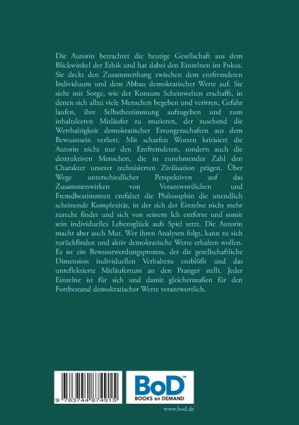 Die Autorin betrachtet die heutige Gesellschaft aus dem Blickwinkel der Ethik und hat dabei den Einzelnen im Fokus. Sie deckt den Zusammenhang zwischen dem entfremdeten Individuum und dem Abbau demokratischer Werte auf. Sie sieht mit Sorge, wie der Konsum Scheinwelten erschafft, in denen sich allzu viele Menschen begeben und verirren, Gefahr laufen, ihre Selbstbestimmung aufzugeben und zum inhaltsleeren Mitläufer zu mutieren, der zusehend die Werthaltigkeit demokratischer Errungenschaften aus dem Bewusstsein verliert. Mit scharfen Worten kritisiert die Autorin nicht nur den Entfremdeten, sondern auch die destruktiven Menschen, die in zunehmender Zahl den Charakter unserer technisierten Zivilisation prägen. Über den Weg unterschiedlichster Perspektiven auf das Zusammenwirken von Verantwortlichen und Fremdbestimmten entfaltet die Philosophin die unendlich scheinende Komplexität, in der sich der Einzelne nicht mehr zurecht findet und sich von seinem Ich entfernt und somit sein individuelles Lebensglück aufs Spiel setzt. Die Autorin macht aber auch Mut. Wer ihren Analysen folgt, kann zu sich zurückfinden und aktiv demokratische Werte erhalten wollen. Es ist ein Bewusstwerdungsprozess, der die gesellschaftliche Dimension individuellen Verhaltens entblößt und das unreflektierte Mitläufertum an den Pranger stellt. Jeder Einzelne ist für sich und damit gleichermaßen für den Fortbestand demokratischer Werte verantwortlich.