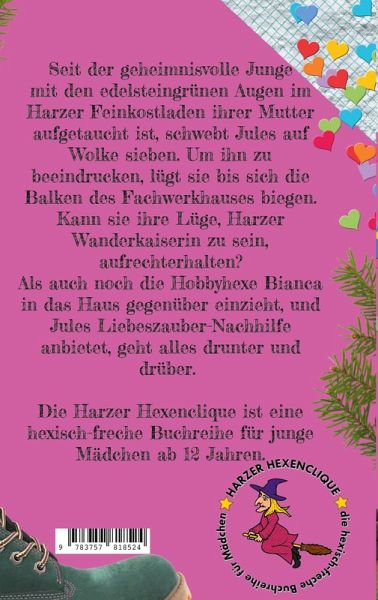 Seit der geheimnisvolle Junge mit den edelsteingrünen Augen im Harzer Feinkostladen ihrer Mutter aufgetaucht ist, schwebt Jules auf Wolke sieben. Um ihn zu beeindrucken, lügt sie bis sich die Balken des Fachwerkhauses biegen. Kann sie ihre Lüge, Harzer Wanderkaiserin zu sein, aufrechterhalten? Als auch noch die Hobbyhexe Bianca in das Haus gegenüber einzieht, und Jules Liebeszauber-Nachhilfe anbietet, geht alles drunter und drüber. Die Harzer Hexenclique ist eine hexisch-freche Buchreihe für junge Mädchen ab 12 Jahren. Verzaubert, witzig und authentisch erzählt, dreht sich bei der Hexenclique…mehr