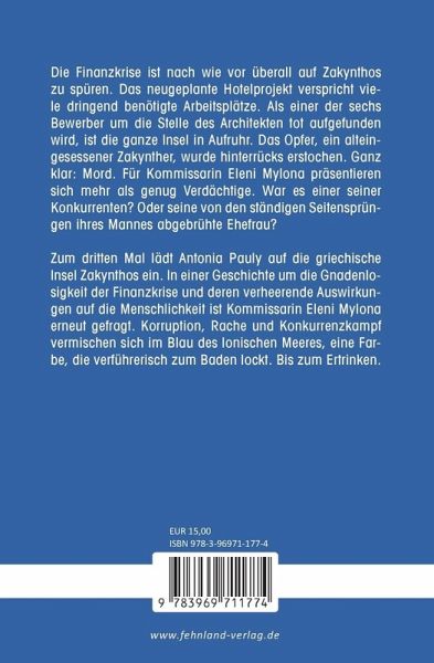 Die Finanzkrise ist nach wie vor überall auf Zakynthos zu spüren. Das neue geplante Hotelprojekt verspricht viele, dringend benötigte Arbeitsplätze. Als einer der sechs Bewerber um die Stelle des Architekten tot aufgefunden wird, ist die ganze Insel in Aufruhr. Das Opfer, ein alteingesessener Zakynthier, wurde hinterrücks erstochen. Ganz klar: Mord. Für Kommissarin Eleni Mylona präsentieren sich mehr als genug Verdächtige. War es einer seiner Konkurrenten? Oder vielleicht seine, von den ständigen Seitensprüngen ihres Mannes abgebrühte, Ehefrau?Zum dritten Mal lädt Antonia Pauly auf die griechische Insel Zakynthos ein. In einer Geschichte um die Gnadenlosigkeit der Finanzkrise und deren verheerenden Auswirkungen auf die Menschlichkeit ist Kommissarin Eleni Mylona erneut gefragt. Korruption, Rache und Konkurrenzkampf vermischen sich in das Blau des Ionischen Meeres, eine Farbe, die verführerisch zum Baden lockt. Bis zum ertrinken.
