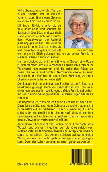 Völlig überraschend erfährt Toni erst in der Pubertät, wer ihr leiblicher Vater ist, aber über dieses Geheimnis vertraut sie sich niemandem an. Mit Ende fünfzig arbeitet sie als freie Journalistin und schreibt ein Sachbuch über Lüge und Wahrheit. Dabei erinnert sie sich, wie sie unter dem Verschweigen der Wahrheit jahrelang gelitten hat. Den Vater hat sie sich in jener Zeit als kaltherzig und verantwortungslos vorgestellt, weil er sie im Stich gelassen hat, um zu seiner Familie in Nieder-Österreich zurückzukehren. Anne Chavez beschreibt das Suchen einer Frau nach ihren Wurzeln und wie es ihr gelingt, den als rücksichtslos vermuteten Vater als fehlbaren Menschen zu akzeptieren und ihm sogar zu verzeihen. Die Autorin schildert auf warmherzige Weise, wie auch ein anfänglich schwieriges Leben gelingen kann. Denn das Leben verlangt nur eins - gelebt zu werden.