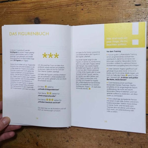 Für die Praktikabilität, ist das robuste Hardcover Buch mit einer Fadenheftung versehen, damit es während des Aufgeschlagenseins, nicht ungewollt zuklappt (streiche es im aufgeklappten Zustand auseinander, damit sich die Fadenbindung entspannt). Es ist von Hand hochwertig in Hamburg verarbeitet worden und bietet alles, was ich mir von einem Luftakrobatik Figurenbuch erträume!