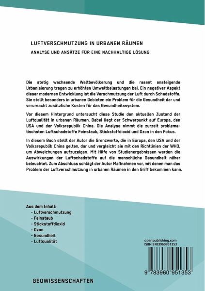 Die stetig wachsende Weltbevölkerung und die rasant ansteigende Urbanisierung tragen zu erhöhten Umweltbelastungen bei. Ein negativer Aspekt dieser modernen Entwicklung ist die Verschmutzung der Luft durch Schadstoffe. Sie stellt besonders in urbanen Gebieten ein Problem für die Gesundheit dar und verursacht zusätzliche Kosten für das Gesundheitssystem. Vor diesem Hintergrund untersucht diese Studie den aktuellen Zustand der Luftqualität in urbanen Räumen. Dabei liegt der Schwerpunkt auf Europa, den USA und der Volksrepublik China. Die Analyse nimmt die zurzeit problematischsten Luftschadstoffe Feinstaub, Stickstoffdioxid und Ozon in den Fokus. In diesem Buch stellt der Autor die Grenzwerte, die in Europa, den USA und der Volksrepublik China gelten, dar und vergleicht sie mit den Richtlinien der WHO, um Abweichungen aufzuzeigen. Mit Hilfe von Studienergebnissen werden die Auswirkungen der Luftschadstoffe auf die menschliche Gesundheit näher beleuchtet. Zum Abschluss schlägt der Autor Maßnahmen vor, mit denen man das Problem der Luftverschmutzung in urbanen Räumen in den Griff bekommen kann. Aus dem Inhalt:- Luftverschmutzung;- Feinstaub;- Stickstoffdioxid;- Ozon;- Gesundheit;- Luftqualität