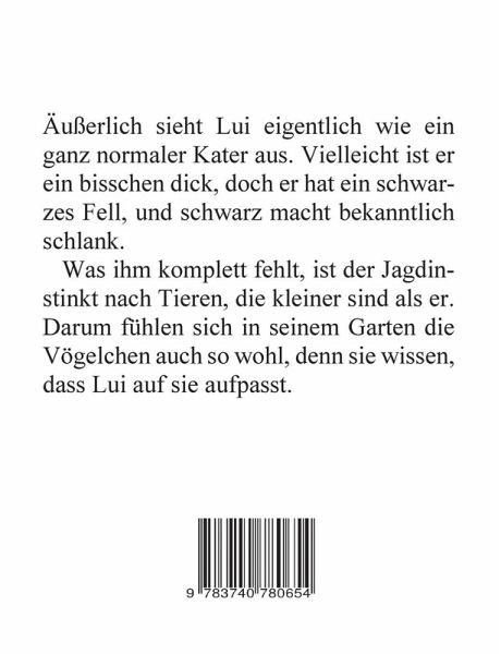 Äußerlich sieht Lui eigentlich wie ein ganz normaler Kater aus. Vielleicht ist er ein bisschen dick, doch er hat ein schwarzes Fell, und schwarz macht bekanntlich schlank. Was ihm komplett fehlt, ist der Jagdinstinkt nach Tieren, die kleiner sind als er. Darum fühlen sich in seinem Garten die Vögelchen auch so wohl, denn sie wissen, dass Lui auf sie aufpasst.