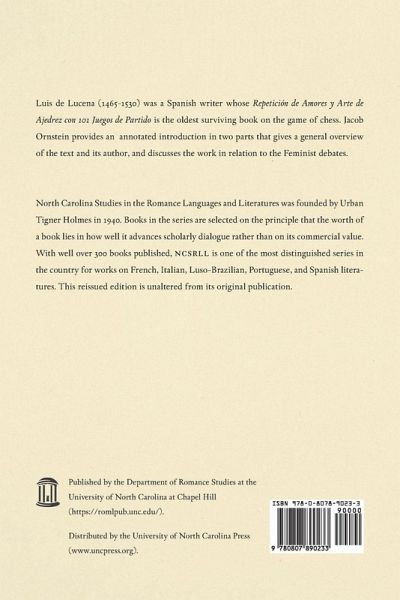 Luis de Lucena (1465-1530) was a Spanish writer whose Repeticion de Amores y Arte de Ajedrez con 101 Juegos de Partido is the oldest surviving book on the game of chess. Jacob Ornstein provides an annotated introduction in two parts that gives a general overview of the text and its author, and discusses the work in relation to the Feminist debates.
