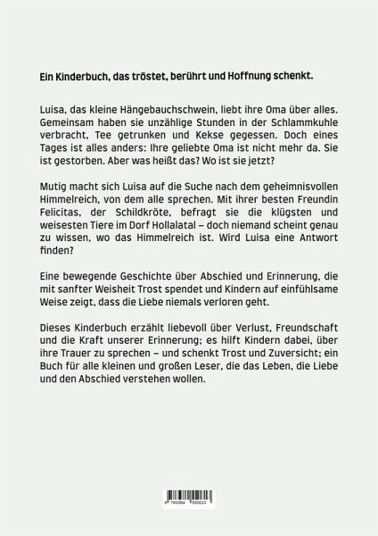 Luisa, das kleine Hängebauchschwein, liebt ihre Oma über alles. Gemeinsam haben sie unzählige Stunden in der Schlammkuhle verbracht, Tee getrunken und Kekse gegessen. Doch eines Tages ist alles anders: Ihre geliebte Oma ist nicht mehr da. Sie ist gestorben. Aber was heißt das? Wo ist sie jetzt? Mutig macht sich Luisa auf die Suche nach dem geheimnisvollen Himmelreich, von dem alle sprechen. Mit ihrer besten Freundin Felicitas, der Schildkröte, befragt sie die klügsten und weisesten Tiere im Dorf Hollalatal - doch niemand scheint genau zu wissen, wo das Himmelreich ist. Wird Luisa eine Antwort finden? Eine bewegende Geschichte über Abschied und Erinnerung, die mit sanfter Weisheit Trost spendet und Kindern auf einfühlsame Weise zeigt, dass die Liebe niemals verloren geht.Dieses Kinderbuch erzählt liebevoll über Verlust, Freundschaft und die Kraft unserer Erinnerung; es hilft Kindern dabei, über ihre Trauer zu sprechen - und schenkt Trost und Zuversicht; ein Buch für alle kleinen und großen Leser, die das Leben, die Liebe und den Abschied verstehen wollen.