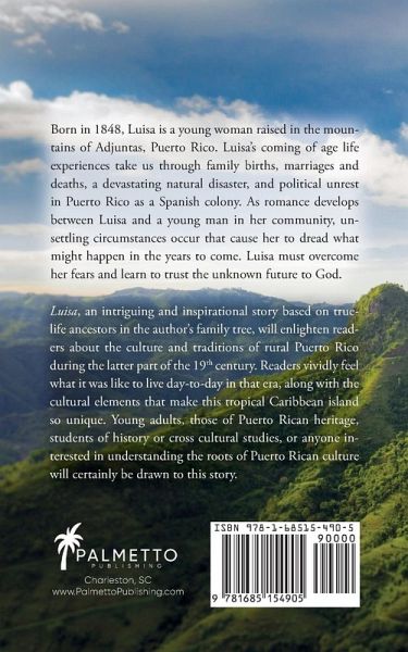 Born in 1848, Luisa is a young woman raised in the mountains of Adjuntas, Puerto Rico. Luisa's coming of age life experiences take us through family births, marriages and deaths, a devastating natural disaster, and political unrest in Puerto Rico as a Spanish colony. As romance develops between Luisa and a young man in her community, unsettling circumstances occur that cause her to dread what might happen in the years to come. Luisa must overcome her fears and learn to trust the unknown future to God. ¿Luisa, an intriguing and inspirational story based on true-life ancestors in the author's family tree will enlighten readers about the culture and traditions of rural Puerto Rico during the latter part of the 19th century. Readers vividly feel what it was like to live day-to-day in that era, along with the cultural elements that make this tropical Caribbean island so unique. Young adults, those of Puerto Rican heritage, students of history or cross cultural studies, or anyone interested in understanding the roots of Puerto Rican culture will certainly be drawn to this story.
