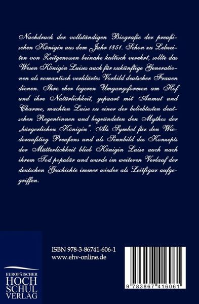 Nachdruck der vollständigen Biografie der preußischen Königin aus dem Jahr 1851. Schon zu Lebzeiten von Zeitgenossen beinahe kultisch verehrt, sollte das Wesen Königin Luises auch für zukünftige Generationen als romantisch verklärtes Vorbild deutscher Frauen dienen. Ihre eher legeren Umgangsformen am Hof und ihre Natürlichkeit, gepaart mit Anmut und Charme, machten Luise zu einer der beliebtesten deutschen Regentinnen und begründeten den Mythos der bürgerlichen Königin . Als Symbol für den Wiederaufsteig Preußens und als Sinnbild des Konzepts der Mütterlichkeit blieb Königin Luise auch nach ihrem Tod populär und wurde im weiteren Verlauf der deutschen Geschichte immer wieder als Leitfigur aufgegriffen.