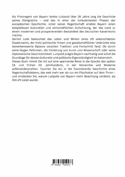Als Prinzregent von Bayern lenkte Luitpold über 26 Jahre lang die Geschicke seines Königreichs - und das in einer der turbulentesten Phasen der europäischen Geschichte. Unter seiner Regentschaft erlebte Bayern einen beispiellosen kulturellen und wirtschaftlichen Aufschwung, der das Land zu einem modernen und prosperierenden Bestandteil des Deutschen Kaiserreichs machte.Gernot Loibl beleuchtet das Leben und Wirken eines oft unterschätzten Staatsmanns, der trotz politischer Krisen und gesellschaftlicher Umbrüche eine bemerkenswerte Balance zwischen Tradition und Fortschritt fand. Ob durch seine klugen Reformen, die Förderung von Kunst und Wissenschaft oder seine diplomatische Geschicklichkeit: Luitpold prägte Bayern nachhaltig und schuf die Grundlage für dessen kulturelle und politische Eigenständigkeit im Kaiserreich.Dieses Buch nimmt Sie mit auf eine spannende Reise in die Epoche des späten 19. und frühen 20. Jahrhunderts, in der Monarchie und Moderne aufeinanderprallten. TauchenSie ein in die faszinierende Geschichte eines Regentschaftslebens, das weit mehr war als nur ein Platzhalter auf dem Thron - und entdecken Sie, warum Luitpold von Bayern mehr Beachtung verdient, als ihm oft zuteil wurde.