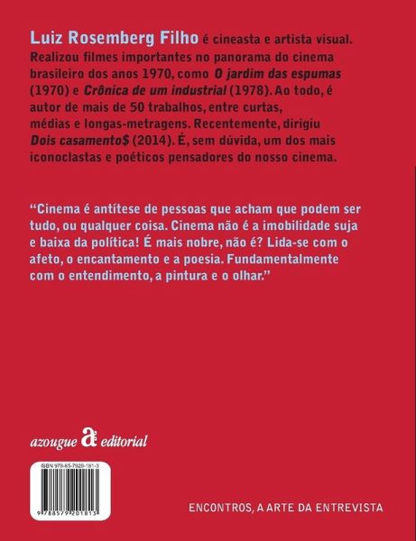 Encontros (Meetings) is the largest and most prestigious book collection of interviews with Brazilian artists and thinkers. With more than 50 published titles, Encontros provides a broad panorama of Brazil's cultural and intellectual wealth. Luiz Rosemberg Filho is a filmmaker and visual artist. He made important films in the panorama of Brazilian cinema in the 1970s, such as "O Jardim de Espumas" (1970) and "Crônica de um Industrial" (1978). In all, he is the author of more than 50 works, among short, medium, and feature films. He is, without a doubt, one of the most iconoclastic and poetic thinkers of our cinema.