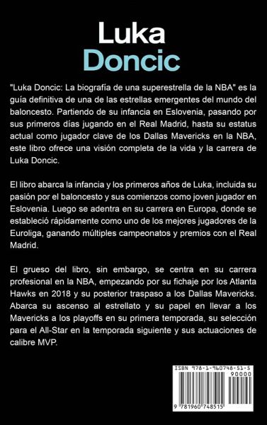 LUKA DONCIC Presentamos "Luka Doncic: La biografía de una superestrella de la NBA", la guía definitiva sobre la vida y la carrera de uno de los jugadores más apasionantes del baloncesto. Descubre la historia del ascenso de Luka Doncic al estrellato de la NBA, desde sus primeros años en Eslovenia hasta sus inolvidables actuaciones en el mayor escenario del mundo. En su interior, aprenderás cómo la pasión de Luka por el baloncesto le ha llevado a convertirse en una de las fuerzas más dominantes de la liga. Sigue su viaje desde sus primeros años jugando en el Real Madrid hasta su primera temporada en la NBA con los Dallas Mavericks, y su meteórico ascenso hasta convertirse en uno de los jugadores más apasionantes de la liga actual. Este libro es perfecto para cualquiera que quiera saber más sobre la trayectoria de Luka, su impacto en la NBA y lo que le depara el futuro a esta sensación del baloncesto. Tanto si eres un fan incondicional de los Mavericks, un aspirante a jugador de baloncesto o simplemente un amante del deporte, "Luka Doncic: La biografía de una superestrella de la NBA" es una lectura esencial que te inspirará y entretendrá. No pierdas la oportunidad de poseer un pedazo de la historia del baloncesto. Pide hoy mismo tu ejemplar de "Luka Doncic: La biografía de una superestrella de la NBA" y descubre por qué esta superestrella es tan especial.