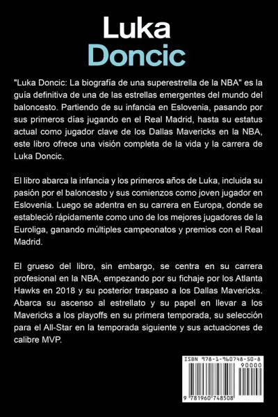 LUKA DONCIC Presentamos "Luka Doncic: La biografía de una superestrella de la NBA", la guía definitiva sobre la vida y la carrera de uno de los jugadores más apasionantes del baloncesto. Descubre la historia del ascenso de Luka Doncic al estrellato de la NBA, desde sus primeros años en Eslovenia hasta sus inolvidables actuaciones en el mayor escenario del mundo. En su interior, aprenderás cómo la pasión de Luka por el baloncesto le ha llevado a convertirse en una de las fuerzas más dominantes de la liga. Sigue su viaje desde sus primeros años jugando en el Real Madrid hasta su primera temporada en la NBA con los Dallas Mavericks, y su meteórico ascenso hasta convertirse en uno de los jugadores más apasionantes de la liga actual. Este libro es perfecto para cualquiera que quiera saber más sobre la trayectoria de Luka, su impacto en la NBA y lo que le depara el futuro a esta sensación del baloncesto. Tanto si eres un fan incondicional de los Mavericks, un aspirante a jugador de baloncesto o simplemente un amante del deporte, "Luka Doncic: La biografía de una superestrella de la NBA" es una lectura esencial que te inspirará y entretendrá. No pierdas la oportunidad de poseer un pedazo de la historia del baloncesto. Pide hoy mismo tu ejemplar de "Luka Doncic: La biografía de una superestrella de la NBA" y descubre por qué esta superestrella es tan especial.