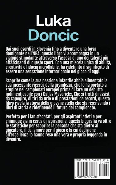 LUKA DONCIC Immergetevi nell'incredibile storia di uno dei talenti più elettrizzanti del basket. Dai suoi primi anni in Slovenia alle sue indimenticabili performance sul più grande palcoscenico dell'NBA, questo libro vi accompagna in un viaggio stimolante attraverso la vita e la carriera di un vero fenomeno. Seguite la sua ascesa dal dominio dei campionati europei all'impatto immediato nell'NBA come Dallas Maverick. Scoprite come le sue abilità uniche, il suo QI cestistico e la sua passione per il gioco lo abbiano trasformato in una delle forze più dominanti del campionato di oggi. Perfetta per i fan sfegatati dei Mavericks, per gli aspiranti giocatori o per chiunque ami questo sport, questa biografia approfondita offre uno sguardo al viaggio, ai risultati e al brillante futuro di un giocatore destinato alla grandezza. Non perdete l'occasione di approfondire la storia di un fenomeno della pallacanestro e di scoprire cosa lo rende così forte dentro e fuori dal campo!
