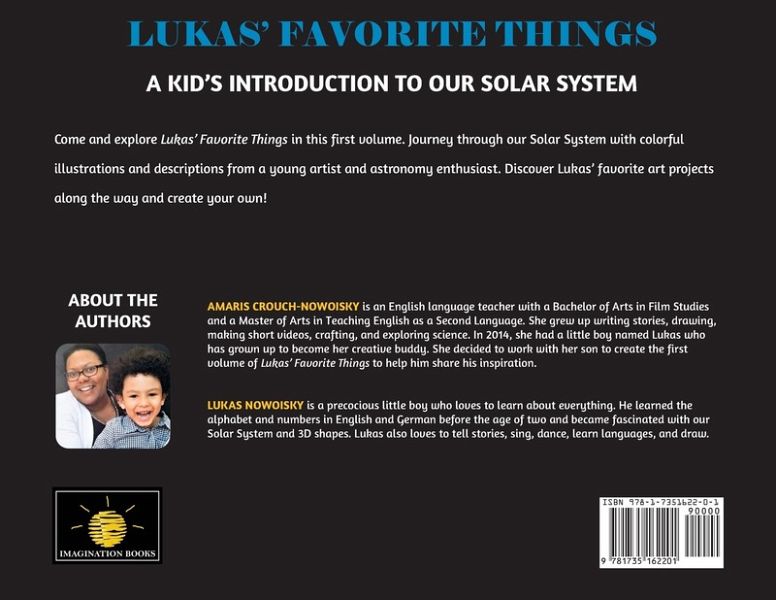 Lukas' Favorite Things: A Kid's Introduction to Our Solar System is a space activity book illustrated by 5-year-old Lukas. Lukas shares twenty-one of his beautifully illustrated pictures of our Solar System, photos of his favorite space projects, and seven hands-on art projects.