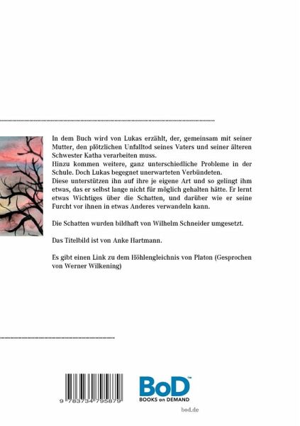 In dem Buch wird von Lukas erzählt, der, gemeinsam mit seiner Mutter, den plötzlichen Unfalltod seines Vaters und seiner älteren Schwester Katha verarbeiten muss. Hinzu kommen unterschiedliche Probleme in der Schule. Doch Lukas begegnet unerwarteten Verbündeten. Diese unterstützen ihn auf ihre je eigene Art und so gelingt ihm etwas, das er selbst lange nicht für möglich gehalten hätte. Er lernt etwas Wichtiges über die Schatten, und darüber wie er seine Furcht vor ihnen in etwas Anderes verwandeln kann.Die Schatten wurden bildhaft von Wilhelm Schneider umgesetzt.Das Titelbild ist von Anke Hartmann.Es gibt einen Link zu dem Höhlengleichnis von Platon (Gesprochen von Werner Wilkening)