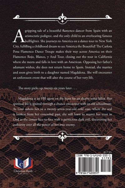 A gripping tale of a beautiful flamenco dancer from Spain with an aristocratic pedigree, and the only child to an overbearing famous bullfighter. She journeys to America on a dance tour in New York City, fulfilling a childhood dream to see America the Beautiful! The Carlota Pena Flamenco Dance Troupe makes their way across America on their Flamenco Rojo, Blanco, y Azul Tour, closing out the tour in California where she meets and falls in love with an American. Opposing her father's adamant wishes, she does not return home to Spain. Instead, she marries and soon gives birth to a daughter named Magdalena. She will encounter an unforeseen event that will alter the course of her very life. The story picks up twenty-six years later . . . Magdalena is an FBI agent on the hunt for an elusive serial killer. Her spiritual life is ignited through a chance encounter with an old schoolmate. As God ushers her to a twenty-seven-year-old cold case, where the seal is broken from her concealed past, she will learn to master her trust in God as she comes face-to-face with a pernicious dark evil, discovering her authority over all the power of her true enemy.