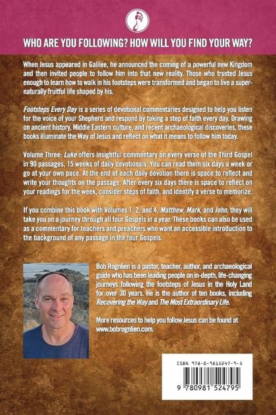 WHO ARE YOU FOLLOWING? HOW WILL YOU FIND YOUR WAY? When Jesus appeared in Galilee, he announced the coming of a powerful new Kingdom and then invited people to follow him into that new reality. Those who trusted Jesus enough to learn how to walk in his footsteps were transformed and began to live a supernaturally fruitful life shaped by his. Footsteps Every Day is a series of devotional commentaries designed to help you listen for the voice of your Shepherd and respond by taking a step of faith every day. Drawing on ancient history, Middle Eastern culture, and recent archaeological discoveries, these books illuminate the Way of Jesus and reflect on what it means to follow him today. Volume Three: Luke offers insightful commentary on every verse of the Third Gospel in 90 passages, 15 weeks of daily devotionals. You can read them six days a week or go at your own pace. At the end of each daily devotion there is space to reflect and write your thoughts on the passage. After every six days there is space to reflect on your readings for the week, consider steps of faith, and identify a verse to memorize. If you combine this book with Volumes 1, 2, and 4, Matthew, Mark, and John, they will take you on a journey through all four Gospels in a year. These books can also be used as a commentary for teachers and preachers who want an accessible introduction to the background of any passage in the four Gospels. They can also be used as a study guide for small groups, Bible studies, and Sunday School classes. Bob Rognlien is a pastor, teacher, author, and archaeological guide who has been leading people on in-depth, life-changing journeys following the footsteps of Jesus in the Holy Land for over 30 years. He is the author of ten books, including Recovering the Way and The Most Extraordinary Life. More resources to help you follow Jesus can be found www.bobrognlien.com.