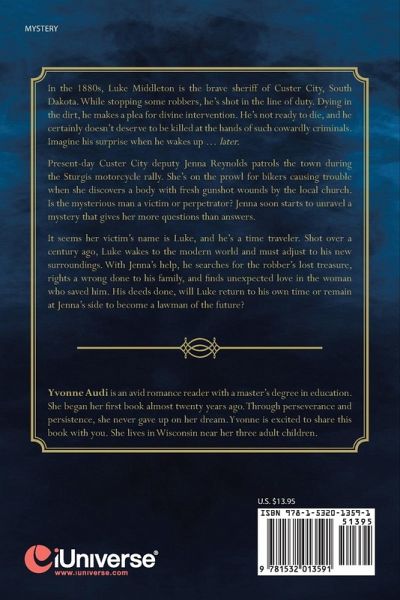 In the 1880s, Luke Middleton is the brave sheriff of Custer City, South Dakota. While stopping some robbers, he's shot in the line of duty. Dying in the dirt, he makes a plea for divine intervention. He's not ready to die, and he certainly doesn't deserve to be killed at the hands of such cowardly criminals. Imagine his surprise when he wakes up … later. Present-day Custer City deputy Jenna Reynolds patrols the town during the Sturgis motorcycle rally. She's on the prowl for bikers causing trouble when she discovers a body with fresh gunshot wounds by the local church. Is the mysterious man a victim or perpetrator? Jenna soon starts to unravel a mystery that gives her more questions than answers. It seems her victim's name is Luke, and he's a time traveler. Shot over a century ago, Luke wakes to the modern world and must adjust to his new surroundings. With Jenna's help, he searches for the robber's lost treasure, rights a wrong done to his family, and finds unexpected love in the woman who saved him. His deeds done, will Luke return to his own time or remain at Jenna's side to become a lawman of the future?