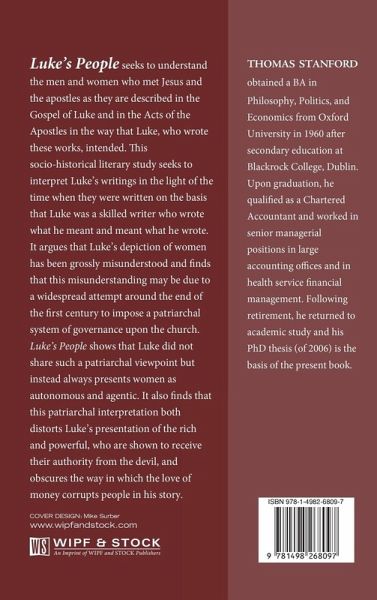 Luke's People seeks to understand the men and women who met Jesus and the apostles as they are described in the Gospel of Luke and in the Acts of the Apostles in the way that Luke, who wrote these works, intended. This socio-historical literary study seeks to interpret Luke's writings in the light of the time when they were written on the basis that Luke was a skilled writer who wrote what he meant and meant what he wrote. It argues that Luke's depiction of women has been grossly misunderstood and finds that this misunderstanding may be due to a widespread attempt around the end of the first century to impose a patriarchal system of governance upon the church. Luke's People shows that Luke did not share such a patriarchal viewpoint but instead always presents Christian women as autonomous and agentic. It also finds that this patriarchal interpretation both distorts Luke's presentation of the rich and powerful, who are shown to receive their authority from the devil, and obscures the way in which the love of money corrupts men in his story.