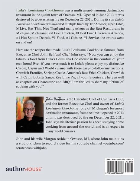 Lula's Louisiana Cookhouse was the multi award winning destination restaurant in the quaint town of Owosso, Mi from 2013 to 2021 when it was destroyed by fire. Best Restaurant in Michigan, Michigan's Best Fried Chicken, Best Fried Chicken in America, Best Bar in Detroit, Best Food, Best Service...the awards went on and on! Here are the long-awaited recipes from Executive Chef John Beilfuss that put Lula's on the map! Chef John says, "Now you can enjoy the great food from Lula's in the comfort of your own home! Even if you never made it to Lula's, please enjoy Lula's distinctive Creole Cajun and World cuisine with my easy-to-follow instructions. Crawfish Etouffee, Shrimp Creole, America's Best Fried Chicken, Crawfish with Cajun Lobster Sauce, they are all here as well as Charcuterie and BBQ! I am thrilled to share my lifetime of cooking with you!"
