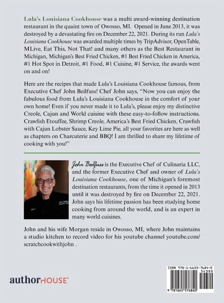 Lula's Louisiana Cookhouse was the multi award winning destination restaurant in the quaint town of Owosso, Mi from 2013 to 2021 when it was destroyed by fire. Best Restaurant in Michigan, Michigan's Best Fried Chicken, Best Fried Chicken in America, Best Bar in Detroit, Best Food, Best Service...the awards went on and on! Here are the long-awaited recipes from Executive Chef John Beilfuss that put Lula's on the map! Chef John says, "Now you can enjoy the great food from Lula's in the comfort of your own home! Even if you never made it to Lula's, please enjoy Lula's distinctive Creole Cajun and World cuisine with my easy-to-follow instructions. Crawfish Etouffee, Shrimp Creole, America's Best Fried Chicken, Crawfish with Cajun Lobster Sauce, they are all here as well as Charcuterie and BBQ! I am thrilled to share my lifetime of cooking with you!"