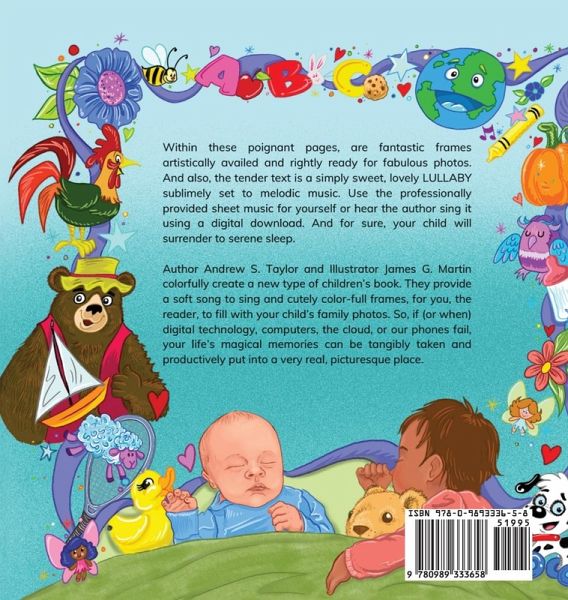 Within these poignant pages, are fantastic frames artistically availed and rightly ready for fabulous photos. And also, the tender text is a simply sweet, lovely LULLABY sublimely set to melodic music. Use the professionally provided sheet music for yourself or hear the author sing it using a digital download. And for sure, your child will surrender to serene sleep. Author Andrew S. Taylor and Illustrator James G. Martin colorfully create a new type of children's book. They provide a soft song to sing and cutely color-full frames, for you, the reader, to fill with your child's family photos. So, if (or when) digital technology, computers, the cloud, or our phones fail, your life's magical memories can be tangibly taken and productively put into a very real, picturesque place.