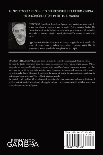 LO SPETTACOLARE SEQUEL DEL BESTSELLER L'ULTIMA CRIPTA PIÚ DI 500.000 LETTORI IN TUTTO IL MONDO. L'ULTIMA CITTÀ PERDUTA è l'attesissimo sequel del bestseller internazionale L'ULTIMA CRIPTA, il romanzo più venduto nella storia di Amazon Spagna. La storia ha inizio pochi mesi dopo l'avventura raccontata nel libro L'ultima cripta, quando Ulises, Cassandra e il professor Castillo sono ormai tornati a casa. Quest'ultimo chiama con urgenza i suoi due amici per spiegargli che sua figlia Valeria è misteriosamente scomparsa nel territorio più remoto e pericoloso della Terra. Disperato, il professore ha deciso di partire in una precipitosa spedizione in solitaria per cercarla, e prega Ulises e Cassie di accompagnarlo. Incapaci di fargli cambiare idea, così come di lasciarlo solo, i due accettano a malincuore di aiutare il vecchio amico nel suo folle tentativo di salvataggio, così tutti e tre, ancora una volta, si imbarcano in una temeraria avventura verso l'ignoto. Un'avventura che non sarà neanche lontanamente come se la aspettano. Un'avventura che li porterà sull'orlo della pazzia. Là dove la realtà si disgrega dalla certezza e l'impensabile diventa inevitabile. Il professore, Cassandra e Ulises non lo sanno ancora, ma nel luogo in cui sono diretti scopriranno una città leggendaria che nessun umano ha abitato per migliaia di anni.Una città incredibile, che non dovrebbe esistere.Una città nella quale, troppo tardi, scopriranno di non essere soli. NOTA DELL'AUTORE La narrazione di L'ULTIMA CITTÀ PERDUTA comincia qualche mese dopo il ritorno a casa di Ulises, Cassie e Castillo, perciò si può facilmente unire la fine di un libro con l'inizio del successivo. Ciononostante, L'ULTIMA CITTÀ PERDUTA è una storia totalmente indipendente che può leggersi perfettamente senza bisogno di conoscere gli antecedenti o aver letto precedentemente L'ULTIMA CRIPTA.