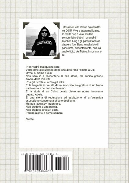Non vedrò mai questo libro. Verrà dato alle stampe dopo che avrò reso l'anima a Dio. Ormai ci siamo quasi. Non sarò io a raccontarvi la mia storia, ma l'unico grande amore della mia vita. L'ha già scritta e io l'ho già letta. E' la tragedia in tre atti di un avvocato emigrato e di un bieco tradimento, che non meritavamo. E' la storia di un Caino celato dietro un nome innocente quanto Abele. E' una storia di redenzione ed espiazione, di un'autentica ossessione consumata al buio degli anni. Ma non lasciatevi ingannare. Non credete a una parola. Non credete ai vostri occhi. Perché niente è come sembra.
