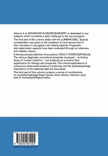 Lumbar Disc.- Differential Diagnosis of Sciatica. Analysis of 3000 Disc Operations.- "Typical Symptoms of a Protruded Lumbar Disc" in Cases of Lumbar Spinal Tumors.- Difficulties Encountered in the Differential Diagnosis of Prolapsed Lumbar Intervertebral Disc (Vertebral Metastases-Polyneuropathy).- Lumbar Disc Protrusion in Childhood and Adolescence.- Lumbar Disc Protrusion in Advanced Age.- Critical Comments on a Comparison of Two Series (1000 Patients Each) of Lumbar Disc Surgery.- A Study of the Medical and Social Problems Involved in Cases of Prolapse of an Intervertebral Disc in the Lumbar Region.- Re-Operations Performed on Patients Suffering from an Intervertebral Disc Prolapse in the Lumbar Region.- Results and Complicated Course After Surgery for Lumbar Disc Herniation.- Complications Following Operation of Herniated Lumbar Discs.- Spondylodiscitis-Lumbar Disc Removal.- The Influence of Lumbar Disc Disease on Psychiatric Symptomatology.- On the Technique of Clearing the Intervertebral Space in Cases of Protruded Lumbar Disc - A Comparison of Two Surgical Methods.- Spinal Joint Syndrome and Interbody Fusion.- A New Surgical Procedure for Lumbar Disc Herniation Causing Less Tissue Damage Through a Microsurgical Approach.- Microsurgical Operation of Herniated Lumbar Disc.- "Traumatische" Bandscheibenvorfälle?.- Adult Hydrocephalus.- Clinical and Morphological Studies on the Development of Hydrocephalus in Adults.- Dynamics of Cerebrospinal Fluid and Pathophysiology of the Hydrocephalus of the Adult.- Subarachnoid Hemorrhage and Hydrocephalus.- Normal Pressure Hydrocephalus - Idiopathic Type Selection of Patients for Shunt Procedures.- Radioisotope Cisternography and Hydrocephalus..- Considerations About the Pathophysiology of the So-CalledCisterno-Ventricular Reflux. Preliminary Report.- Cerebral Blood Flow and Cerebrospinal Fluid Pressure in Patients with Communicating Hydrocephalus.- Acute Intracranial Volume Fluctuation.- Pre- and Postoperative Evaluation of Hydrocephalus Using the Infusion Test....- Long-Term Measurements of the Intraventricular Pressure in Patients with Normal-Pressure Hydrocephalus.- Diagnosis of Hydrocephalus by Computerized Tomography.- Free Communications.- Results of Conservative and Surgical Early Treatment of Cervical Spine Injuries.- Prognosis of Severe Head and Brain Injury in Childhood.- Secondary Blood Coagulation Disturbances After Severe Brain Injury.- Clinical Double-Blind-Study on the Effects of Dexamethasone on Severe Closed Head Injuries.- The Influence of Dexamethasone on the Pattern of Intracranial Pressure Distribution in Patients with Brain Tumors.- Resolution of Peritumoral Brain Edema Following Combination Therapy with Dexamethasone and Furosemide.- Effects of a Local Cryogenic Lesion on Enzyme Activities in Cat Brain.- Therapy of Experimental Brain Edema in Cats.- EEG-Monitoring During Early Phases of Neurosurgical Intensive Care. Posttraumatic Limbic Epilepsy.- Cliniconeurological and Computer-Analysed EEG Investigations of Patients in Coma Following Operation for Cerebral Trauma.- EEG-Analytical Follow-Up Study of Stroke Patients Under Hyperbaric Oxygen Treatment.- Arousal-Reactions with Unconscious Patients Elicited by L-Dopa, Amantadine-HCl and Akineton.- Somatosensory Evoked Potentials (SEP) in Patients with Peripheral, Spinal and Supraspinal Lesions of the Sensory System.- The Effect of Electrical Spinal Cord Stimulation on Spastic Movement Disorders.- Advanced Cytological Techniques in the Examination of Human Cerebrospinal Fluid.- Arterio-VenousCommunications in the Posterior Cranial Fossa. Anatomical Study.- Microsurgical Reconstruction of Cauda Equina Fibers. Experimental Study in the Pig.- A Simple Method for Localizing the Foramen of Monroe in Plain X-Rays.- On the Possibility of Indirect Respiratory Rate Monitoring.- Simultaneous Biplane Angioautotomography for the Analysis of Intracranial Aneurysms.- Computer Assistance for Stereotactic Brain Operations.- Results of Operative Treatment of Acromegaly.- Investigation on the Prognosis of Brain Abscess.- Intracerebellar Pneumocephalus. Case Report.- Malignant Lymphomas of the Brain.- The Use of the Fogarty Catheter Method in the Treatment of Carotid-Cavernous Sinus Fistulas and Giant Basal Sack-Shaped Aneurysms.- Histological and Radiological Results of Discography with Water-Soluble and Oily Contrast Media in Rabbits.- Neurotransmitter - Shifts in Cerebro-Organic Processes.- The Diagnostic Accuracy of Imprint Cytology for Neurosurgical Biopsies.- Reconstructive Surgery of Spinal Cord Vessels. An Experimental Study.