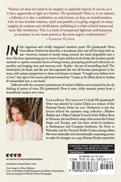 In the ingenious and vividly imagined narrative poem The Lumberjack’s Dove, GennaRose Nethercott describes a woodsman who cuts off his hand with an axe—however, instead of merely being severed, the hand shapeshifts into a dove. Far from representing just an event of pain and loss in the body, this incident spirals outward to explore countless facets of being human, prompting profound reflections on sacrifice and longing, time and memory, and—finally—the act of storytelling itself. The lumberjack, his hand, and the axe that separated the two all become participants in the story, with unique perspectives to share and lessons to impart. “I taught your fathers how to love,” Axe says to the acorns and leaves around her. “I mean to be felled, sliced to lumber, & reassembled into a new body.” Inflected with the uncanny enchantment of modern folklore and animated by the sly shifting of points of view, The Lumberjack’s Dove is wise, richly textured poetry from a boundlessly creative new voice.