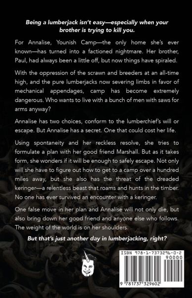 Being a lumberjack isn't easy-especially when your brother is trying to kill you. For Annalise, Younish Camp-the only home she's ever known-has turned into a factioned nightmare. Her brother, Paul, had always been a little off, but now things have spiraled. With the oppression of the scrawn and breeders at an all-time high, and the pure lumberjacks now severing limbs in favor of mechanical appendages, camp has become extremely dangerous. Who wants to live with a bunch of men with saws for arms anyway? Annalise has two choices: conform to the lumberchief's will or escape. But Annalise has a secret. One that could cost her life. Using spontaneity and her reckless resolve, she tries to formulate a plan with her good friend Marshall. But as it takes form, she wonders if it will be enough to safely escape. Not only will she have to figure out how to get to a camp over a hundred miles away, but she also has the threat of the dreaded keringer-a relentless beast that roams and hunts in the timber. No one has ever survived an encounter with a keringer. One false move in her plan and Annalise will not only die, but also bring down her good friend and anyone else who follows. The weight of the world is on her shoulders. But that's just another day in lumberjacking, right?
