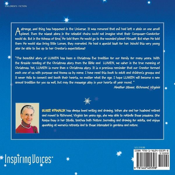 A strange, sad thing has happened in the Universe. It was rumored that evil had left a stain on one small planet. Even the wisest stars in the celestial choirs could not imagine what their Composer-Conductor would do. But in the fulness of time, He told them He would go to the wounded planet Himself. But when He told them He would also bring little Lumen, they marveled. He had a special task for her. Would this very young star be able to live up to her Creator's expectations? "The beautiful story of LUMEN has been a Christmas Eve tradition for our family for many years. With the fireside reading of the Christmas story from the Bible and LUMEN, we usher in the true meaning of Christmas. Yet, LUMEN is more than a Christmas story. It is a precious reminder that our Creator formed each one of us with purpose and knows us by name. I have read this book to adult and children's groups and it never fails to connect and touch their hearts, no matter what the age. I hope LUMEN will become a new annual tradition for you as well, but may the message stay in your hearts all year round. " Heather Stoner, Richmond, Virginia