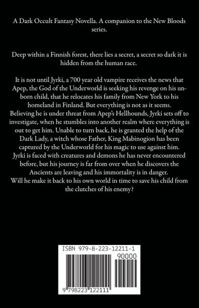 A Dark Occult Fantasy Novella. A companion to the New Bloods series. Deep within a Finnish forest, there lies a secret, a secret so dark it is hidden from the human race. It is not until Jyrki, a 700 year old vampire receives the news that Apep, the God of the Underworld is seeking his revenge on his un-born child, that he relocates his family from New York to his homeland in Finland. But everything is not as it seems. Believing he is under threat from Apep's Hellhounds, Jyrki sets off to investigate, when he stumbles into another realm where everything is out to get him. Unable to turn back, he is granted the help of the Dark Lady, a witch whose Father, King Mabinogion has been captured by the Underworld for his magic to use against him. Jyrki is faced with creatures and demons he has never encountered before, but his journey is far from over when he discovers the Ancients are leaving and his immortality is in danger. Will he make it back to his own world in time to save his child from the clutches of his enemy?