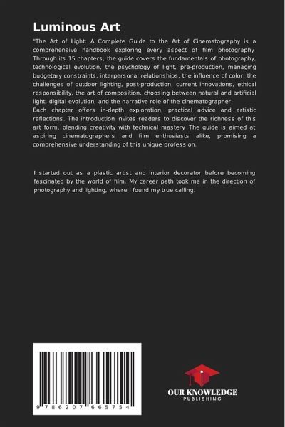 "The Art of Light: A Complete Guide to the Art of Cinematography is a comprehensive handbook exploring every aspect of film photography. Through its 15 chapters, the guide covers the fundamentals of photography, technological evolution, the psychology of light, pre-production, managing budgetary constraints, interpersonal relationships, the influence of color, the challenges of outdoor lighting, post-production, current innovations, ethical responsibility, the art of composition, choosing between natural and artificial light, digital evolution, and the narrative role of the cinematographer.Each chapter offers in-depth exploration, practical advice and artistic reflections. The introduction invites readers to discover the richness of this art form, blending creativity with technical mastery. The guide is aimed at aspiring cinematographers and film enthusiasts alike, promising a comprehensive understanding of this unique profession.