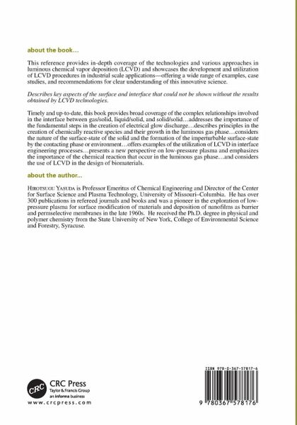 Providing in-depth coverage of the technologies and various approaches, Luminous Chemical Vapor Deposition and Interface Engineering showcases the development and utilization of LCVD procedures in industrial scale applications. It offers a wide range of examples, case studies, and recommendations for clear understanding of this innovative science. The book comprises four parts. Part 1 describes the fundamental difference between glow discharge of an inert gas and that of an organic vapor, from which the concepts of Luminous Gas Phase derive. Part 2 explores the various ways of practicing Luminous Vapor Disposition and Treatment depending on the type and nature of substrates. Part 3 covers some very important aspects of surface and interface that could not have been seen clearly without results obtained by application of LCVD. Part 4 offers some examples of interface engineering that show very unique aspects of LCVD interface engineering in composite materials, biomaterial surface and corrosion protection by the environmentally benign process. Timely and up-to-date, the book provides broad coverage of the complex relationships involved in the interface between a gas/solid, liquid/solid, and a solid/solid. The author presents a new perspective on low-pressure plasma and describes key aspects of the surface and interface that could not be shown without the results obtained by LCVD technologies. Features Provides broad coverage of complex relationships involved in interface between a gas/solid, a liquid/solid, and a solid/solid Addresses the importance of the initial step of creating electrical glow discharge Describes the principles of creating chemically reactive species and their growth in the luminous gas phase Focuses on the nature of surface-state of solid and on the creation of imperturbable surface-state by the contacting phase or environment, which is vitally important in creating biocompatible surface, providing super corrosion protection of metals by environmentally benign processes, etc. Offers examples on how to use LCVD in the interface engineering process Presents a new view on low-pressure (low-temperature) plasma and emphasizes the importance of luminous gas phase and chemical reactions that occur in the phase About the author: Dr. Yasuda is one of the pioneers who explored low-pressure plasma for surface modification of materials and deposition of nano films as barrier and perm-selective membranes in the late 1960s. He obtained his PhD in physical and polymer chemistry working on transport properties of gases and vapors in polymers at State University of New York, College of Environmental Science and Forestry at Syracuse, NY. He has over 300 publications in refereed journals and books, and is currently a Professor Emeritus of Chemical Engineering, and Director, Center for Surface Science & Plasma Technology, University of Missouri-Columbia, and is actively engaged in research on the subjects covered by this book.