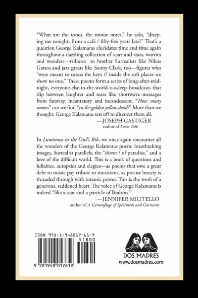 In this collection of poetry, Luminous in the Owl's Rib, former Indiana Poet Laureate, George Kalamaras, continues his ongoing project of "seeing one in the other"-poems that explore the interface of the human and natural world. Following his Surrealist forebears, Kalamaras explores the complexity of language, with startling images and juxtapositions, as a vehicle for visionary poetics. Writing a series of poems for musicians (including some of his favorite jazz greats), along with a several elegies for poets dear to him, Kalamaras explores late-night moments of a generative solitude that leave the realms of loneliness, becoming expansive and interconnected. These poems seek to connect our human impulses to the realms of the spiritual and the discursive. In the process, the poems honor the varieties of human and animal experience-mammals, marsupials, and the insect world, even probing the intelligence and "vision" that lie at the heart of molecules. The luminosity in the owl-the profundity of the numinous-Kalamaras shows us, lies inside the owl, even within the intimate space of a rib. SAMPLE: The Sound Behind Water People are always asking, Which house is this? They open a door, and my chest sprouts sparrows They close a window as an avocado dirts to seed They look for the outline of a tree in fog It is barely there, behind their water Beneath the sky Inside the grass Is a shape that moves like an eel In the marsh of your eyes I see myself struggling for sound Like a hermit who, even after years of silence, Can't forget his own name We are struck to the earth like a bar of scented soap An egret who has grown an extra leg I move hesitantly, feeling a larger portion of the world Weighing less than a ballroom without snow I float further into myself Like a clock narrowing as it leaves midnight Like a thin rug that has taken many years to weave