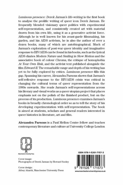 Luminous presence: Derek Jarman's life-writing is the first book to analyse the prolific writing of queer icon Derek Jarman. Much of Jarman's powerful, imaginative response to HIV/AIDS can be found in his remarkable books, which Alexandra Parsons argues were critical in changing the cultural terms of queer representation in the 1980s and 1990s. -- .