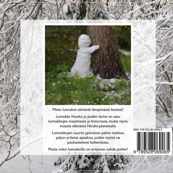 Miten lumiukot selviävät lämpimästä kesästä? "Lumiukko Nuoska ja puiden tarina" on satu lumiukkojen maailmasta ja historiasta, mutta myös muusta elämästä Nivalis -planeetalla. Lumiukkojen suuriin pyöreisiin päihin mahtuu paljon erilaisia ajatuksia, joiden myötä ne puuhastelevat kaikenlaista. Mutta miksi lumiukoilla on erityinen suhde puihin?