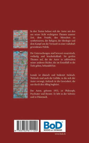 In drei Texten befasst sich der Autor mit den aus seiner Sicht wichtigsten Themen unserer Zeit, dem Projekt, den Menschen zu synthetisieren, der Religion, der Ideologie und dem Kampf um die Vernunft in einer wahnhaft gewordenen Politik. Die Untersuchungen sind bewusst essayistisch, vorläufig und bruchstückhaft. Sie greifen Themen wieder auf, die der Autor bereits in zahlreichen seiner anderen Büchern, die im Einzelfall in die Tiefe gehen, behandelt hat. Lumsk ist dänisch und bedeutet tückisch. Tückisch sind die Gefilde, in die sich der Autor vorwagt, und tückisch ist jede Gewissheit, von der wir im Alltag ausgehen. Fast überall zeigt es sich, dass man den Menschen lebenslang belügt und betrügt, bis er anfängt, selber zu denken.