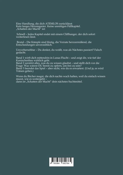 Band 2: "Die Herrschaft der Schatten" Luna hat Valeris getötet. Doch sein Erbe lebt weiter - in ihr, in Leo, und in den anderen Prototypen, die wie sie gebrochen und manipuliert wurden._ Kai, der jüngste von ihnen, ist kein Klon, sondern Valeris' Sohn - und der Schlüssel zu einer Wahrheit, die allesverändern wird._ Elias, der gefährlichste Prototyp, weiß mehr, als er sagt - und er spielt ein tödliches Spiel mit Luna._ Darius, Valeris' rechter Arm, ist nicht tot - und er will Luna benutzen, um die ultimative Macht an sich zu reißen.Doch die wahre Bedrohung lauert im Dunkeln: Ein fünfter Prototyp, ungebrochen, unaufhaltsam - und entschlossen, Luna zu vernichten.Wer wird überleben? Wer wird regieren? Und wer wird zum Monster, das Valeris immer in ihnen gesehen hat?