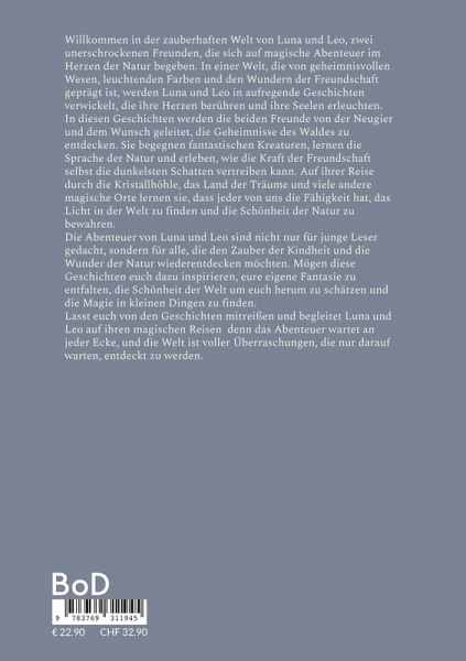 Willkommen in der zauberhaften Welt von Luna und Leo, zwei unerschrockenen Freunden, die sich auf magische Abenteuer im Herzen der Natur begeben. In einer Welt, die von geheimnisvollen Wesen, leuchtenden Farben und den Wundern der Freundschaft geprägt ist, werden Luna und Leo in aufregende Geschichten verwickelt, die ihre Herzen berühren und ihre Seelen erleuchten. In diesen Geschichten werden die beiden Freunde von der Neugier und dem Wunsch geleitet, die Geheimnisse des Waldes zu entdecken. Sie begegnen fantastischen Kreaturen, lernen die Sprache der Natur und erleben, wie die Kraft der Freundschaft selbst die dunkelsten Schatten vertreiben kann. Auf ihrer Reise durch die Kristallhöhle, das Land der Träume und viele andere magische Orte lernen sie, dass jeder von uns die Fähigkeit hat, das Licht in der Welt zu finden und die Schönheit der Natur zu bewahren. Die Abenteuer von Luna und Leo sind nicht nur für junge Leser gedacht, sondern für alle, die den Zauber der Kindheit und die Wunder der Natur wiederentdecken möchten. Mögen diese Geschichten euch dazu inspirieren, eure eigene Fantasie zu entfalten, die Schönheit der Welt um euch herum zu schätzen und die Magie in kleinen Dingen zu finden. Lasst euch von den Geschichten mitreißen und begleitet Luna und Leo auf ihren magischen Reisen denn das Abenteuer wartet an jeder Ecke, und die Welt ist voller Überraschungen, die nur darauf warten, entdeckt zu werden.