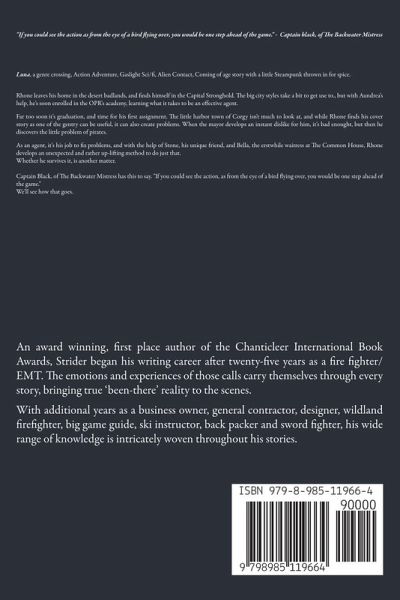 Luna, a totally awesome, genre-crossing, action adventure, gaslight sci/fi, coming-of-age, alien contact story, with a little steampunk thrown in for spice. Rhone leaves his home in the desert badlands, and finds himself in the Capital Stronghold where the the big city styles take a bit to get use to. With Aundrea's help, he's enrolled in the OPR's academy, learning what it takes to be an effective agent. Far too soon it's graduation, and time for his first assignment. The little harbor town of Corgy isn't much to look at, and while Rhone finds his cover story as one of the gentry can be useful, it can also create problems, as the mayor develops an instant dislike for him. Then he discovers the little problem of pirates. As an agent, it's his job to fix problems, and with the help of Stone, his unique friend, and Bella, the erstwhile waitress at The Common House, Rhone develops an unexpected and rather up-lifting method to do just that. Whether he survives it, is another matter. Captain Black, of The Backwater Mistress has this to say. "If you could see the action, as from the eye of a bird flying over, you would be one step ahead of the game." We'll see how that goes. LUNA, book 2 of, The Adventures of Rhone & Stone.